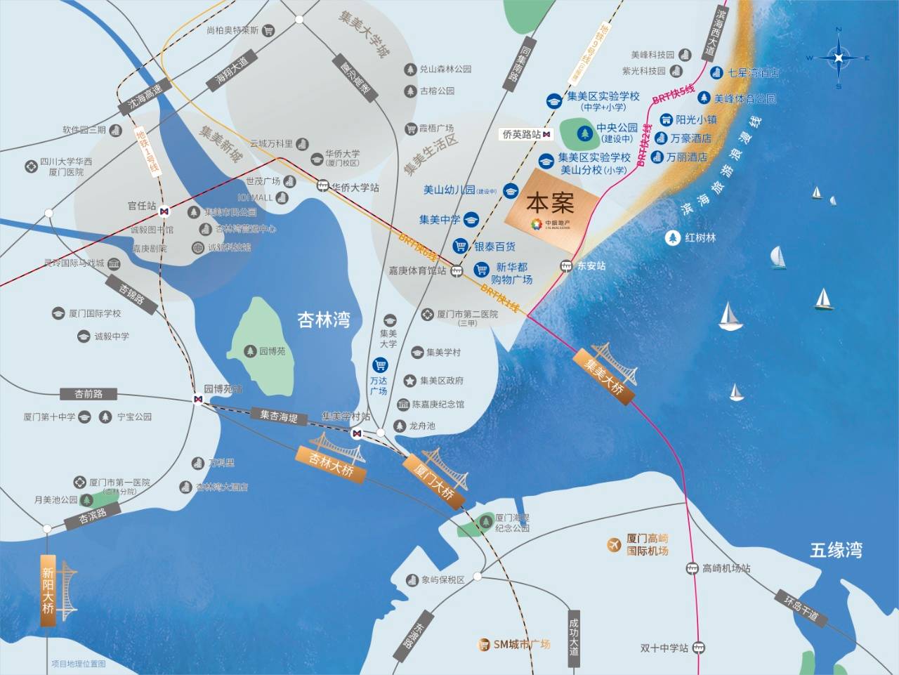 中旅·海玥所处的区位,交通方面四通八达,经过集美大桥直接衔接五缘外湾,BRT东安站离项目仅200米,10分钟即可进岛。项目左近有6号线和9号线两条地铁经过,其中6号线为岛外环线,10分钟可直达软三。9号线为进岛线路,只需4站便可直达岛内。项目与6/9号线侨英站(在建)直线间隔约650米,滨海西大道站(规划中)直线间隔约300米,属于地铁房。而远期规划中的环东海域进岛通道,也不到10分钟车程。大桥、海底隧道、BRT、地铁等各种各样的进岛通道,都被中旅·海玥占全了,而且地铁一下就来两条。便利的交通出行,一方面大幅提升了业主们交往岛内外、城市各区的便利度,使业主们的出行方式有了更多样化的选择。另一方面,地铁加持的项目升值潜力常常也更大。